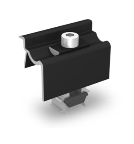 Black anodised universal module end clamp with simple click function for fixing solar modules with frame heights of 30-42 mm. Not compatible with the K2 Dome 6 system and K2 FlatRail, SolidRail L/ LS /XL and CrossRail 62/ 90.
