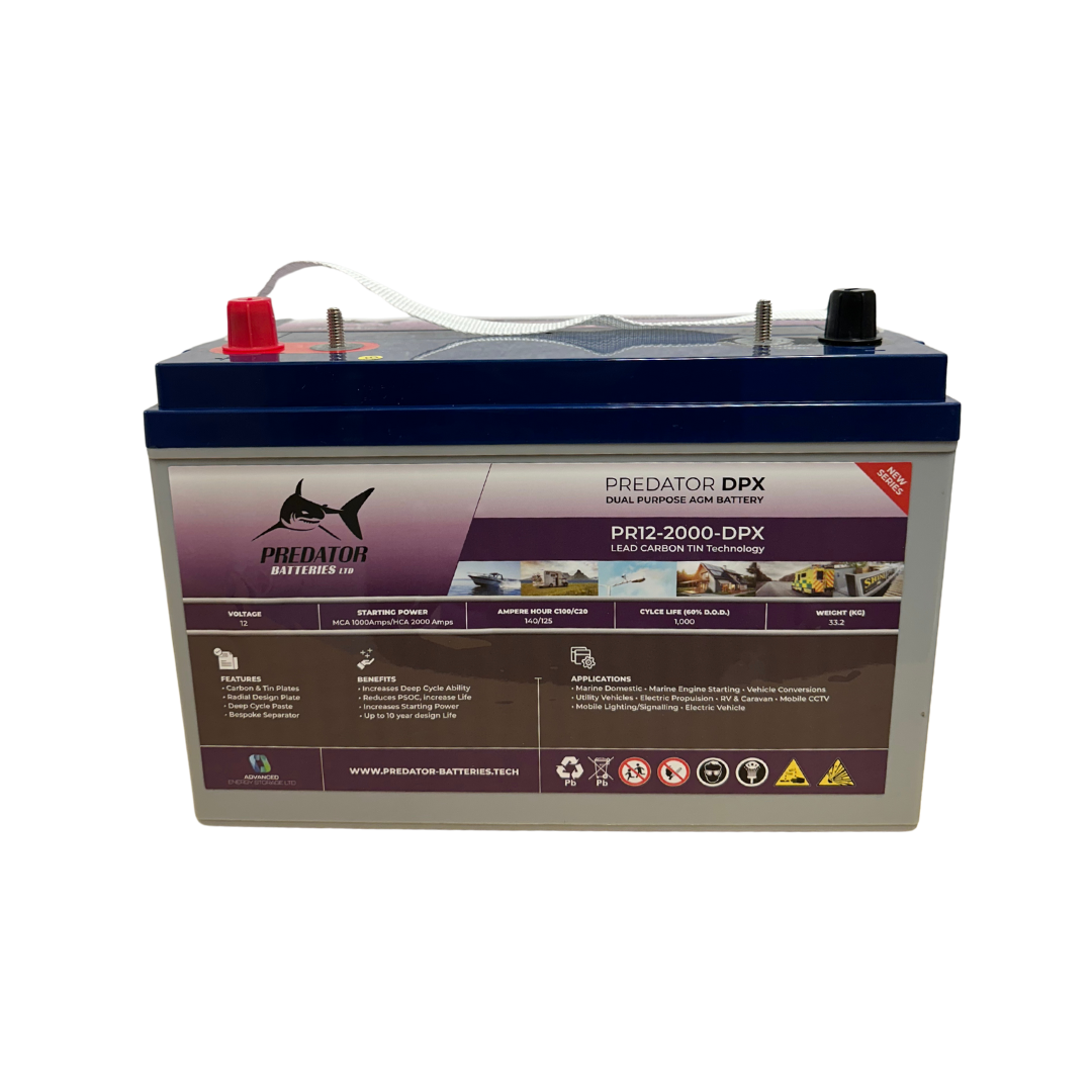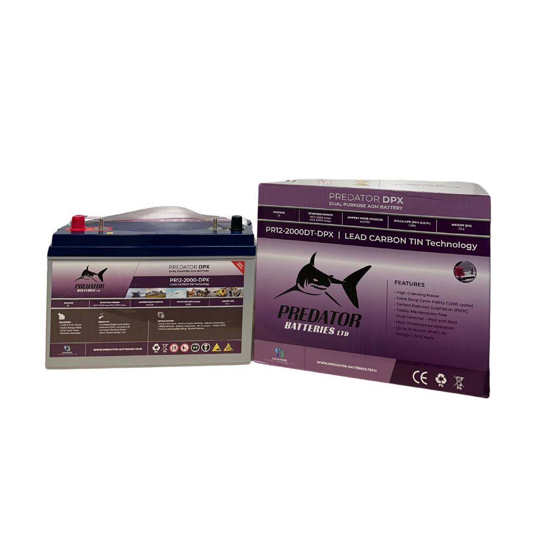 The Predator DPX Dual Purpose battery is a versatile AGM battery designed to combine starting power and deep cycling. It is designed to serve both as a cranking battery (for starting engines) and a deep cycle battery (for running electronics and other devices).