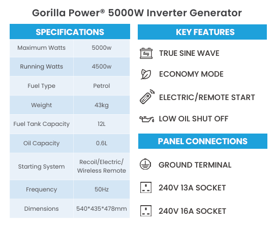The Gorilla Power 5000W Inverter Open Frame Generator is designed for high-powered applications, delivering reliable and efficient energy wherever you need it. With a 4500W continuous output, economy mode for fuel savings, and True Sine Wave technology, this generator is perfect for home backup power, construction sites, and outdoor events.