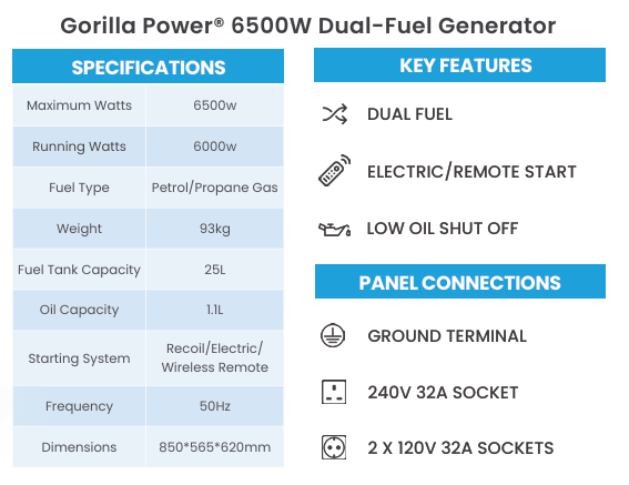 The Gorilla Power 6500W Dual-Fuel Generator delivers unmatched versatility, running on both petrol and propane. Designed for home backup, construction, and outdoor use, it provides 6000W of continuous power and features an easy-to-use wireless remote start.