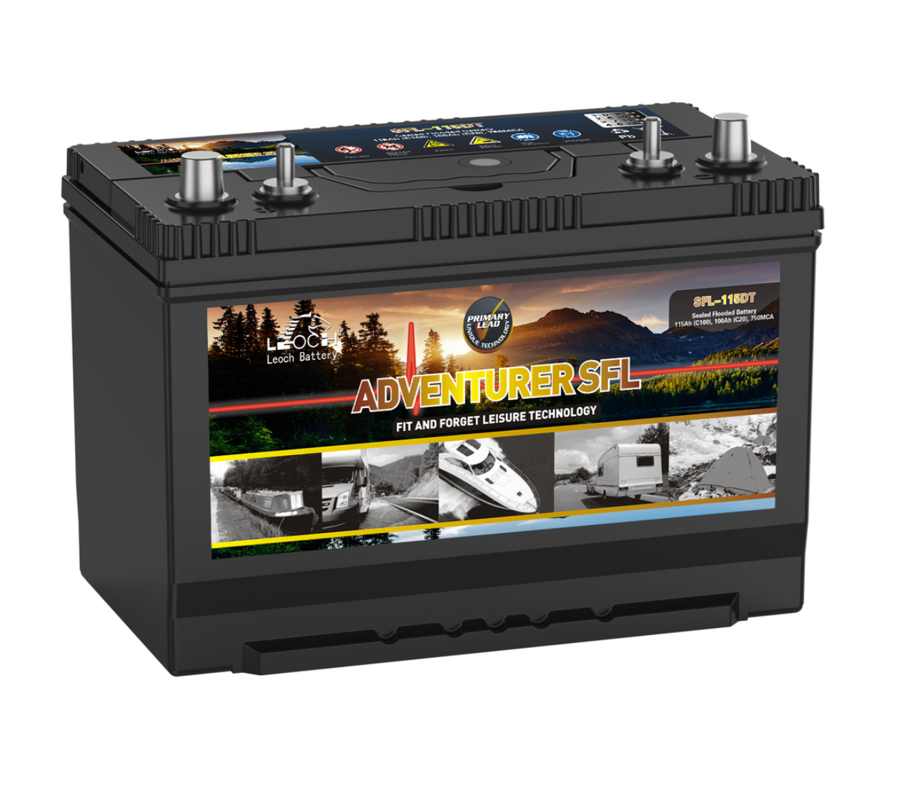 12V 110Ah flooded lead-acid battery for leisure use, with twin terminals – from Leoch’s Adventurer SFL range.