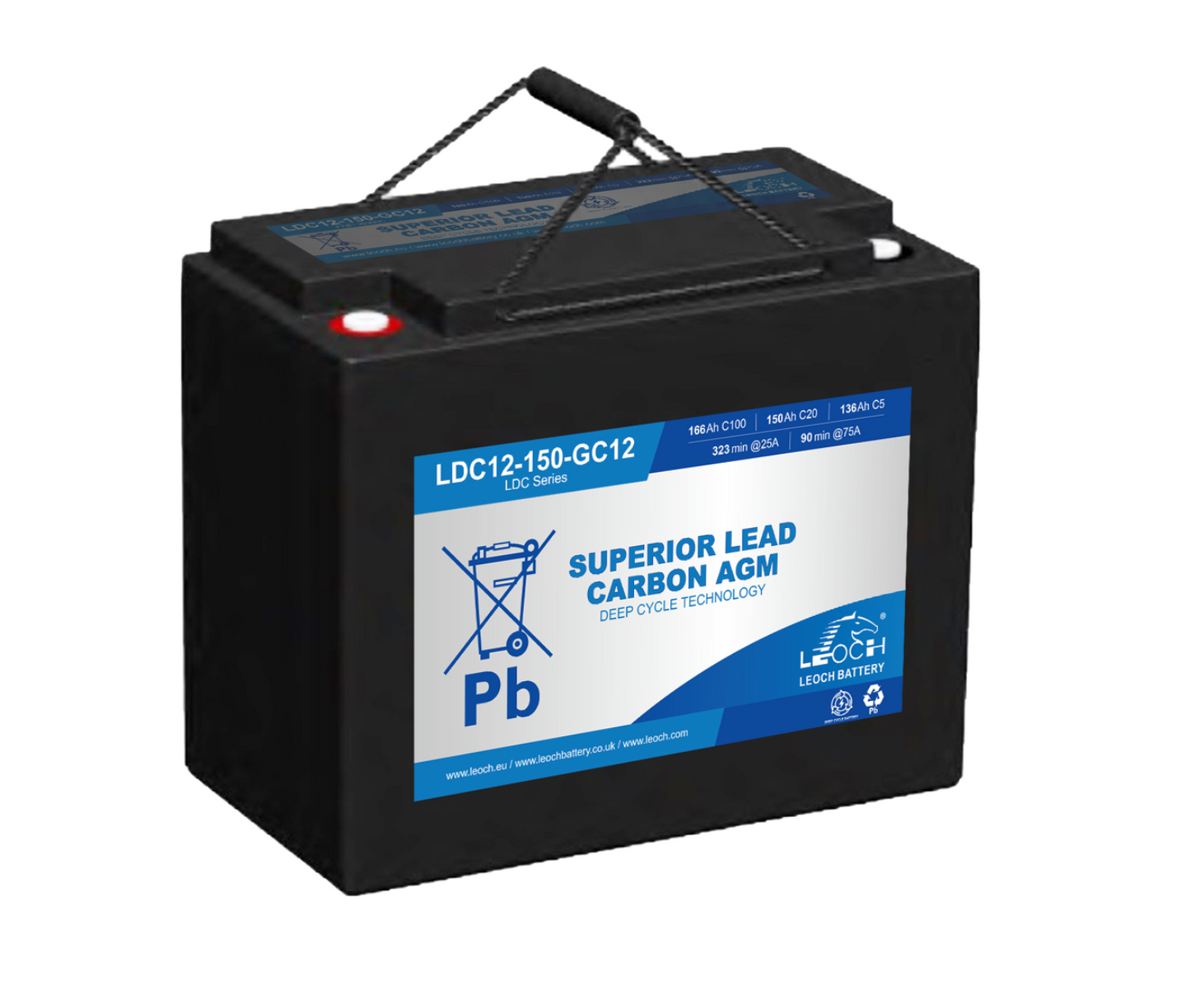 The LDC12-150-GC12, a 12V 150Ah BCI Group GC12 Deep Cycle Battery by Leoch, is an ideal power solution for various applications. Its true deep cycle AGM technology and green design make it suitable for renewable energy systems, such as solar panels and wind turbines. With its heavy-duty grid/paste design, it is well-suited for deep cycle applications like marine and RV use, providing reliable power for extended periods. Additionally, its high energy density and super anti-vibration design make it a reliable choice for off-grid and backup power systems. Its true deep cycle AGM technology and heavy-duty grid/paste design make it an excellent choice for powering golf carts and other electric vehicles on the course. Whether it's for recreational vehicles, marine vessels, renewable energy systems, or backup power, the LDC12-150-GC12 battery offers dependable performance and long-lasting power.