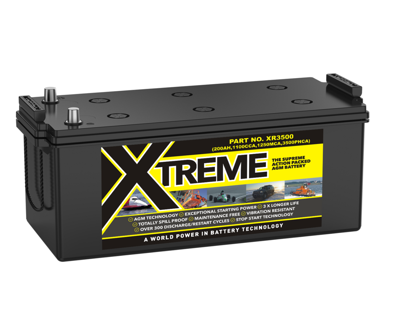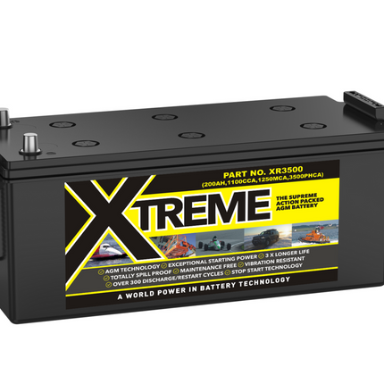 The Leoch XR-3500 Xtreme Battery, a high-performance dual-purpose AGM battery with a capacity of 200Ah, a voltage of 12V, and a cold cranking amperage (CCA) of 1100. Designed to deliver reliable power for all your needs, the XR-3500 ensures optimal performance in demanding conditions. Its advanced AGM technology and robust design make it the ideal choice for marine, leisure, and commercial applications, providing both starting and deep cycle capabilities.