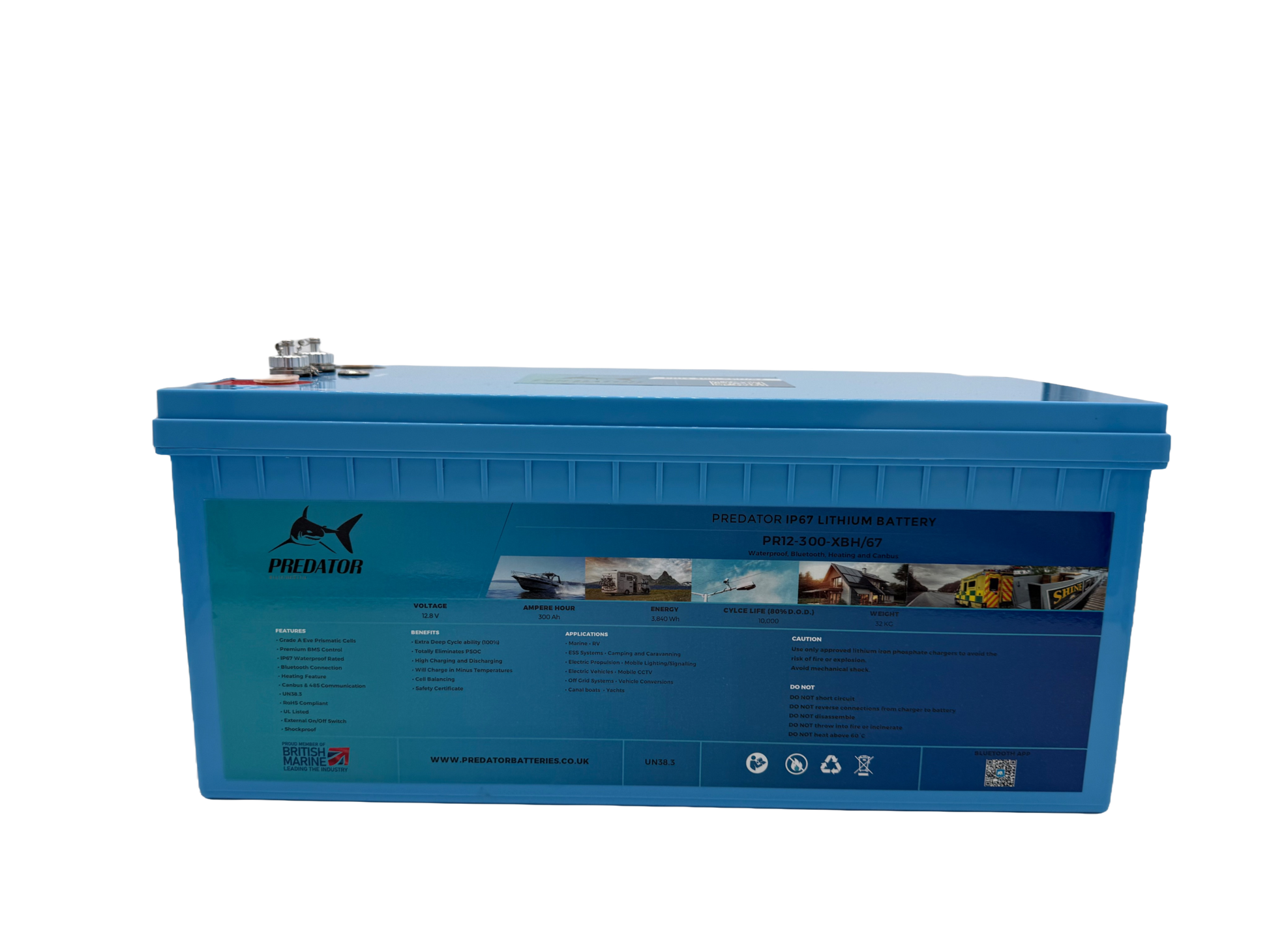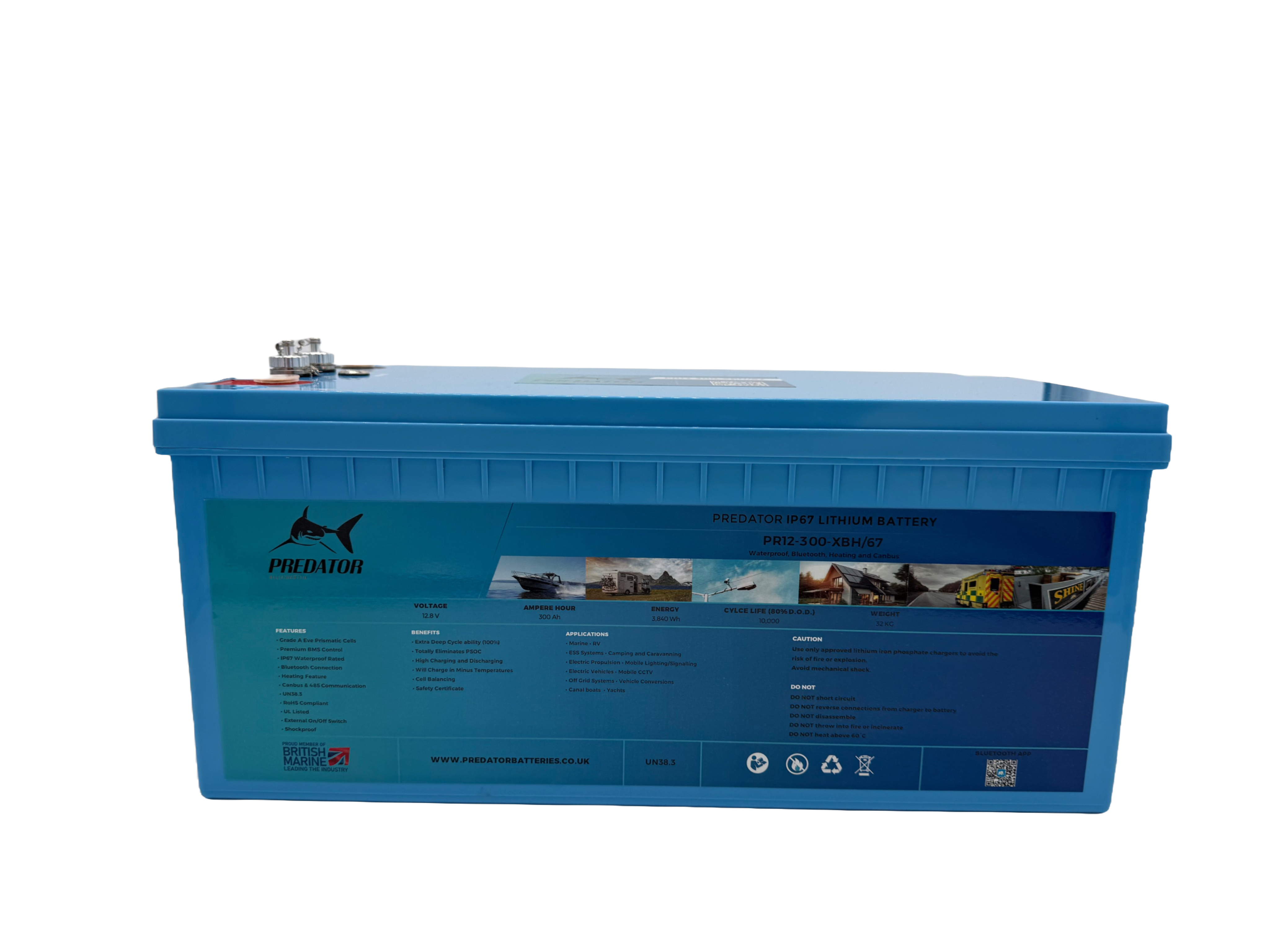 The Predator 12v 300ah IP67 3,840Wh of power and comes with a 10 year warranty, Delivering 5000 cycles and a peak discharge current of 400A the predator XBH/67 range is a real game changer in Lithium Leisure and Marine Batteries.