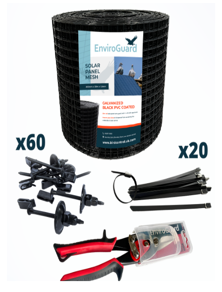- Includes one roll of black PVC coated hot dipped galvanised steel wire mesh, 60 solar mesh clips, stainless steel corner ties and cutting tool