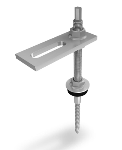 K2 SolidRail Hanger Bolt Set M10x200 with adapter plate and fiber cement seal. For fixing the K2 Systems components in the timber substructure, suitable for corrugated fibre cement roofing. Length wood thread 67 mm. Length metric thread 85 mm. General approval. Material: Stainless steel A2/ Aluminium/ EPDM