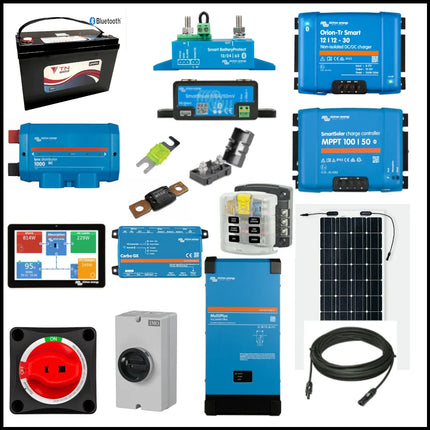 This 12V van conversion kit is a perfect kit for a conversion where you are wishing to charge from the alternator and solar using all premium branded products. This kit includes everything you need for a simple conversion and allows you to monitor your system via a Bluetooth device. This kit also includes a Victron Multiplus which will allow you to convert the 12V battery supply into 230V.