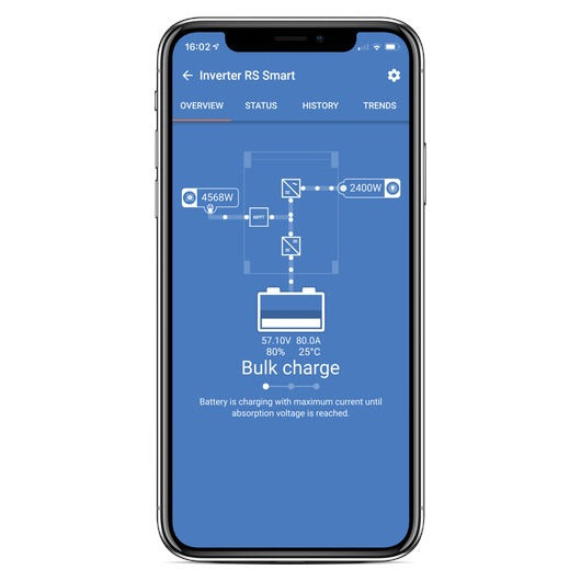 The display reads battery and inverter parameters. The same parameters can be accessed with a smartphone or other Bluetooth enabled device. In addition, Bluetooth can be used to set up the system and to change settings with VictronConnect.