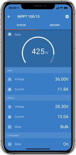 Remotely control and monitor the extensive features of your SmartSolar MPPT charger with built-in bluetooth by pairing it with your smartphone or other device via VictronConnect. If your installation is connected to the internet Victron Remote Management Portal (VRM) provides access to the full power of your MPPT, anytime, anywhere; both services are free to use. For remote installations – even when there is no internet connection or phone signal nearby – you may be able to monitor your MPPT by bluetooth-pairing with a LoRaWAN (long-range wide area network) device, available optionally.